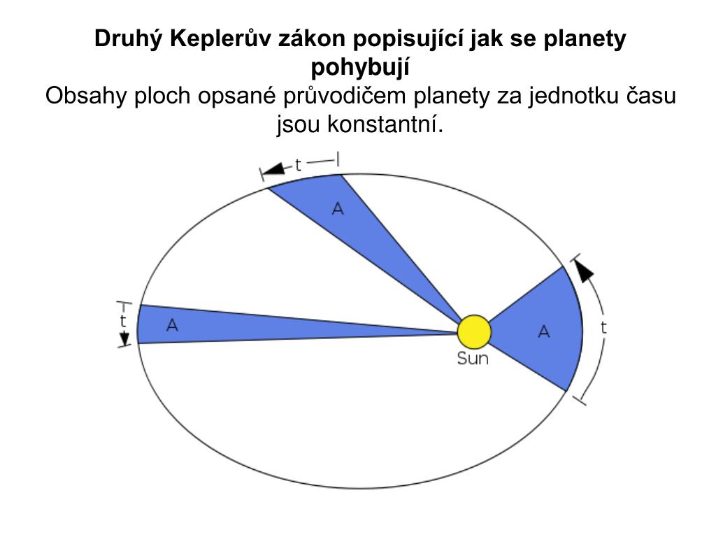 Tím oba zákony vysvětlil až o 80 let později isaac newton. Druhý keplerův zákon plochy opsanéprůvodičem planety za jednotku času jsou konstantní. Průvodič je úsečka spojující střed planety se středem slunce.jeho velikost i směr se během pohybu planety stále mění, ale obsahy ploch, které opíše za stejné doby jsou stejné. Obsahy ploch opsaných průvodičem planety za jednotku času jsou konstantní.. Jak tedy druhý keplerův zákon zní?